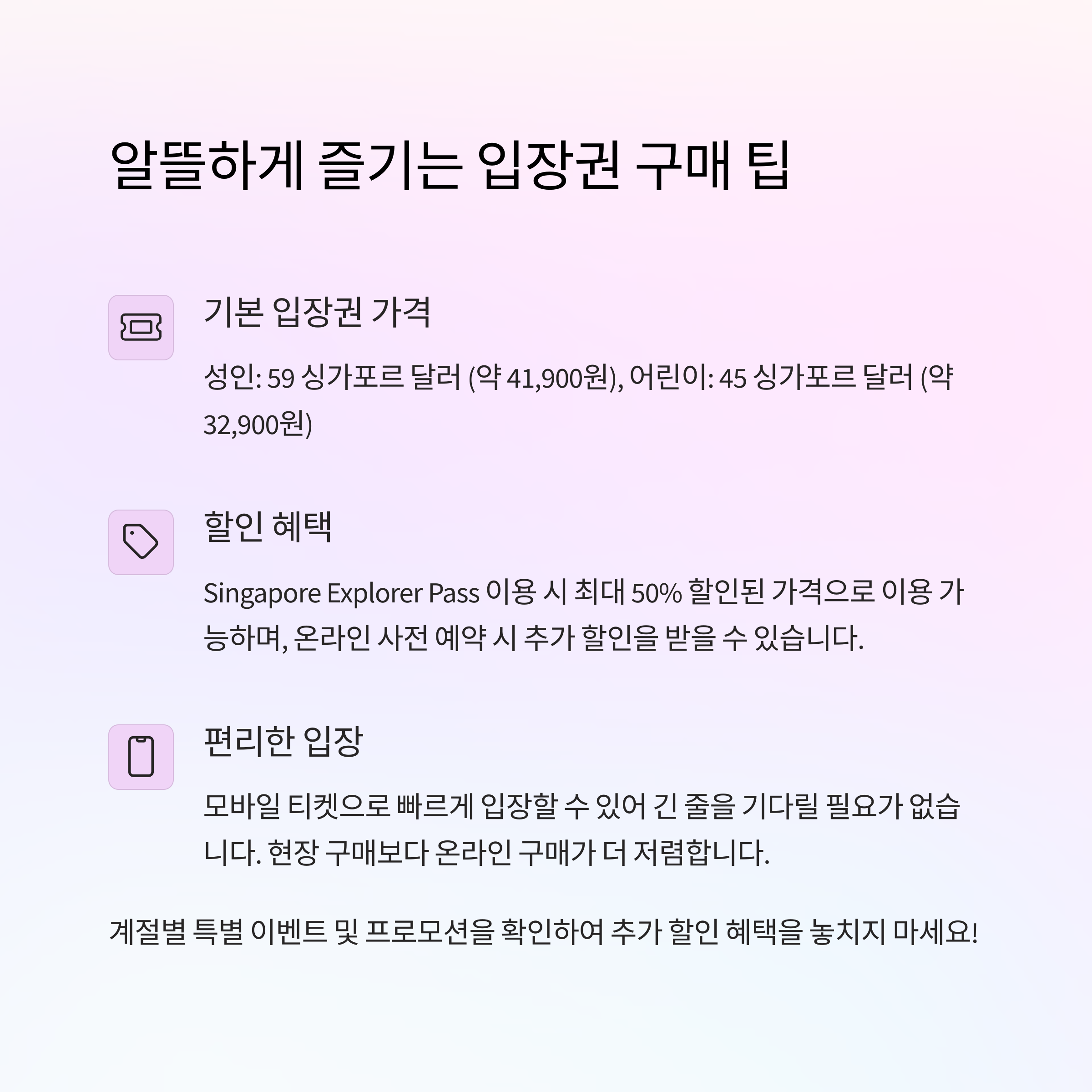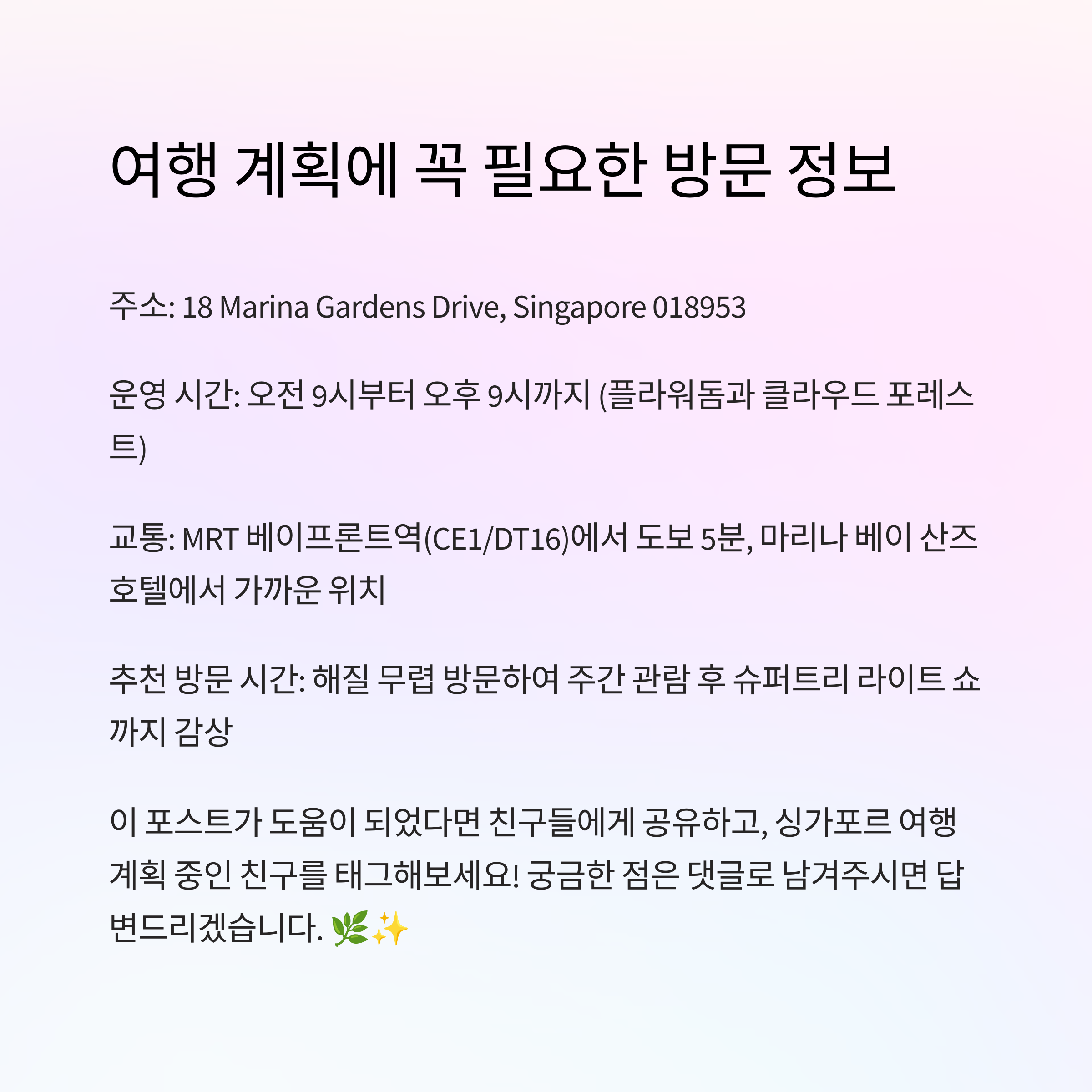 특히, 슈퍼트리 쇼나 외관 관람은 무료로 개방되어 있어 입장권 없이도 일부 즐길 거리가 있다는 점 참고하세요.
