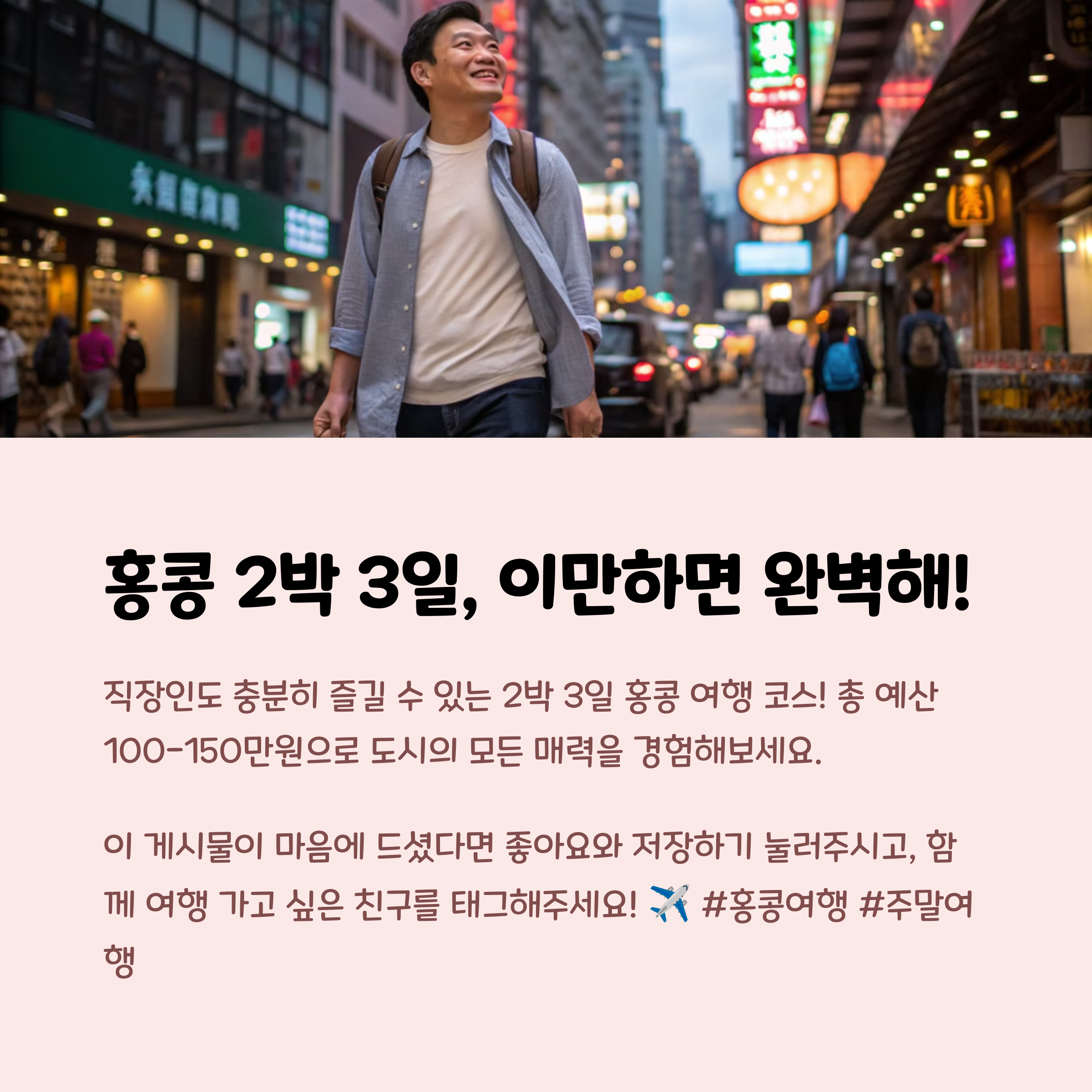 매일 반복되는 회사 생활에 지친 당신, 잠시 일상을 벗어나 짧지만 강렬한 휴식이 필요하지 않으신가요? 주말에 훌쩍 떠날 수 있는 홍콩 여행으로 당신의 지친 마음에 활력을 불어넣어 드릴게요. 이메일과 회의실을 잠시 잊고, 화려한 야경과 맛있는 음식이 기다리는 홍콩으로 함께 떠나볼까요?